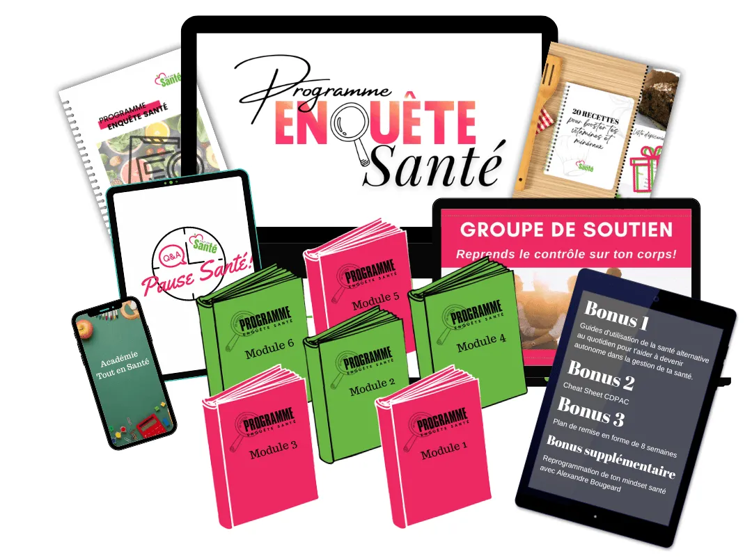 BEAUCOUP! Premièrement, ta coach est unique. J'ai eu un excès de poids, j'ai fait la transformation, j'ai eu des résultats. Aujourd'hui, j'ai pas une taille de guêpe non plus, je l'aurai probablement jamais mais je me maintien et je suis dans l'équilibre. Alors ta réalité, je la connaît. Contrairement à celles qui n'ont jamais eu un problème de poids, j'ai traversé des hauts et des bas, alors je sais d'où tu viens et où tu vas. Déjà ça, c’est ÉNORME! Ensuite, sur le plan purement pédagogique, le programme Enquête Santé est axée sur les meilleurs outils qui fonctionnent pour toi, ce qui est unique. Mon but: te fournir les meilleures stratégies et outils pour reprendre le contrôle de ta santé qui fonctionnent aujourd'hui.